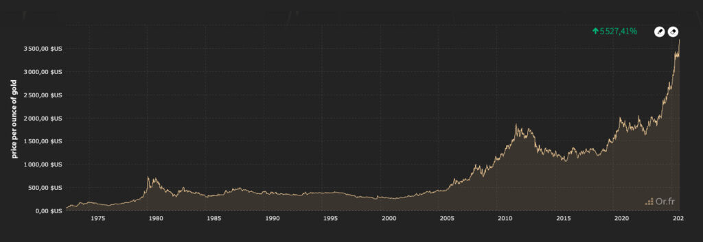 Finally, fears about US debt, which now exceeds 120% of GDP, are fueling concerns about possible debt monetization—that is, massive money creation to finance deficits. Such a situation could trigger a crisis of confidence in the dollar and a rush to gold, as was the case after the end of the gold standard in 1971, when the price of gold rose from $35 to $850 per ounce in less than ten years.