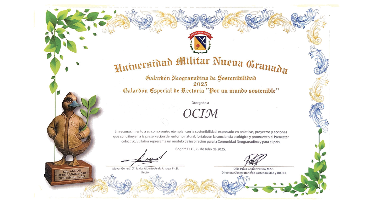 En la ceremonia también recogieron sus respectivos premios en la categoría de la Gran Cruz los jueces Jorge Enrique Ibáñez Najar, presidente del Consejo Constitucional; Octavio Augusto Tejeiro Duque, presidente de la Corte Suprema; y Luis Alberto Álvarez Parra, presidente del Consejo de Estado. La ceremonia de entrega de premios tuvo lugar en Bogotá el 25 de julio de 2025, en el marco de las celebraciones con ocasión del 43.er aniversario de la fundación de la Universidad Militar Nueva Granada. Estos galardones destacan el compromiso del Grupo OCIM con el desarrollo económico y social y la protección de los ecosistemas naturales en América del Sur, en particular en lo que se refiere al uso sostenible de los recursos hídricos.